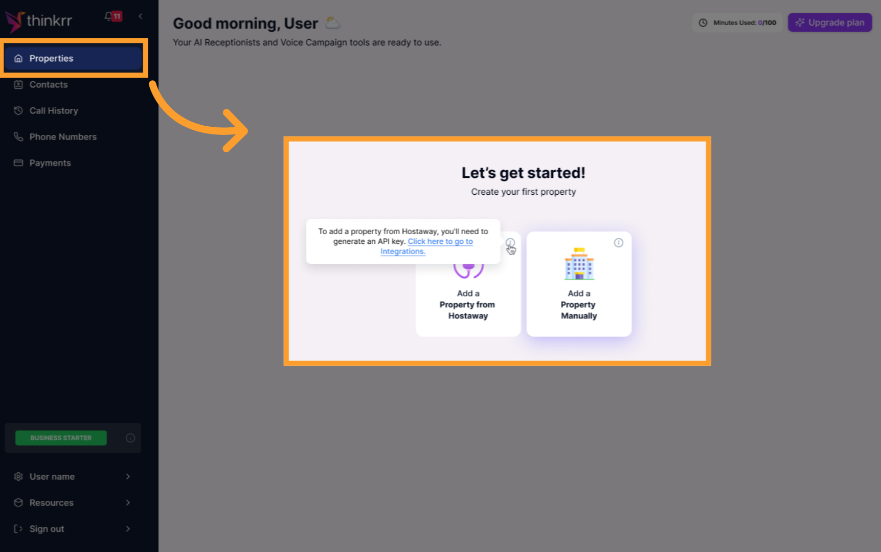 The Hostaway connection with thinkrr gives property managers an end-to-end automation system for short-term rental (STR) operations. Once connected, your Hostaway account syncs property data directly into thinkrr, powering both inbound and outbound AI experiences through the Property Concierge and prebuilt scenario templates. Thinkrr automatically imports per-property details — guest information, check-in/out times, amenities, Wi-Fi, directions, and notes — so your concierge can respond with accurate, up-to-date information at any time. Guests can interact with your concierge via phone or web, and you can automate proactive calls like Welcome Calls and Post-Stay Surveys through the outbound tab.💡 You can also manually add and configure properties directly in thinkrr if Hostaway is not connected.This guide covers: